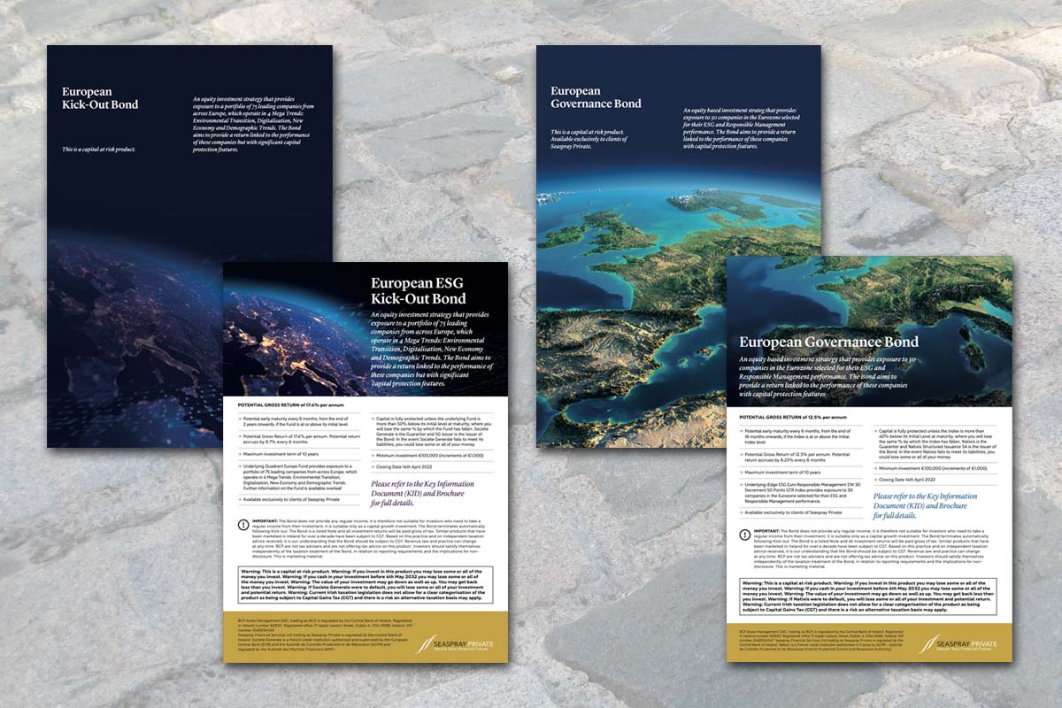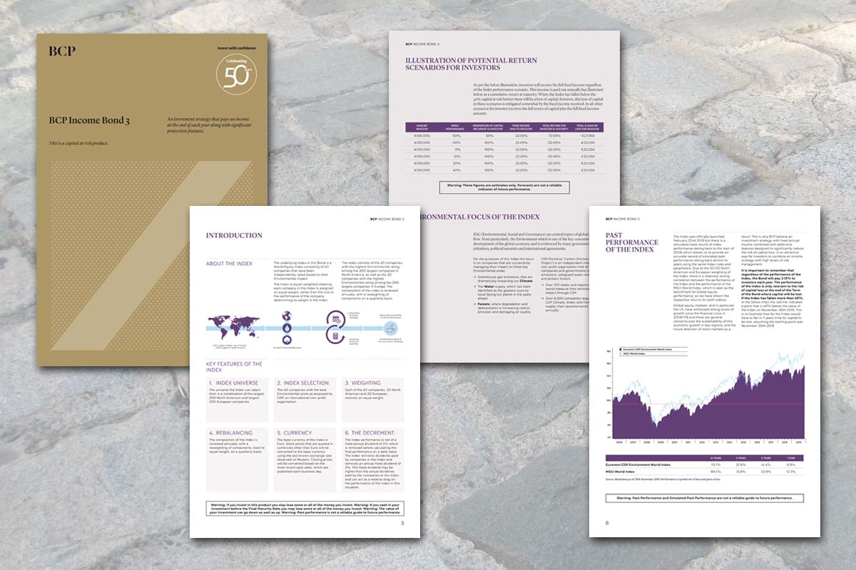 BCP is one of Ireland's largest independently owned Investment Product Providers for the advisor market. When BCP updated their brand guidelines, we were supplied an initial set of design files. From these I set up master documents ready for multi-line product literature, this included;